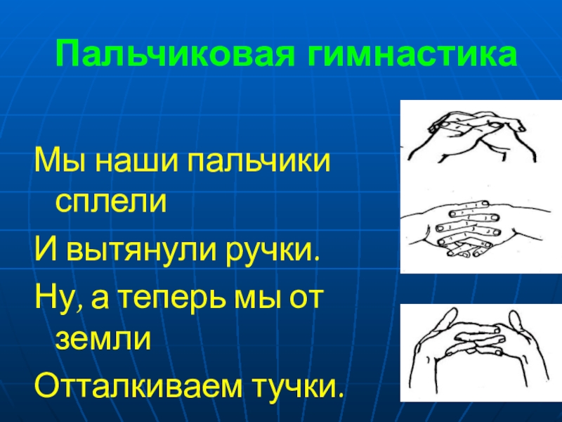 Пальчиковая гимнастикаМы наши пальчики сплелиИ вытянули ручки.Ну, а теперь мы от землиОтталкиваем тучки.