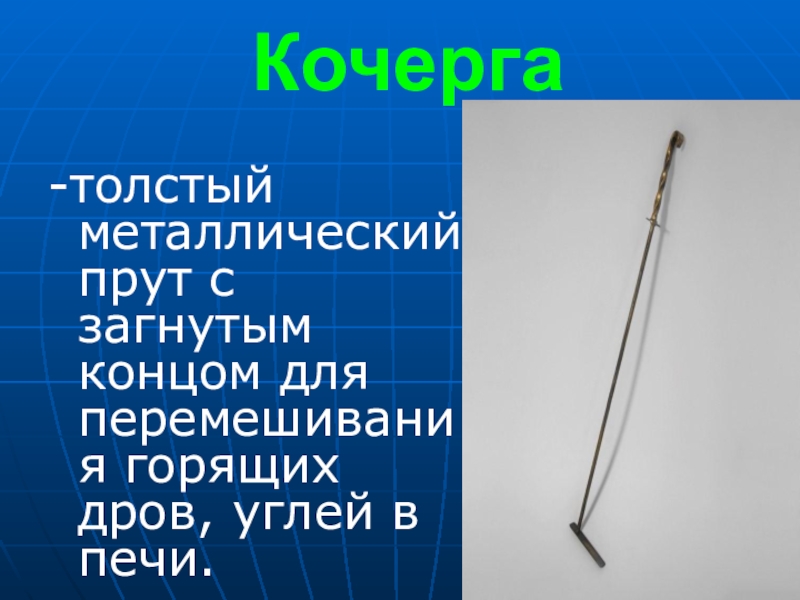 Кочерга-толстый металлический прут с загнутым концом для перемешивания горящих дров, углей в печи.