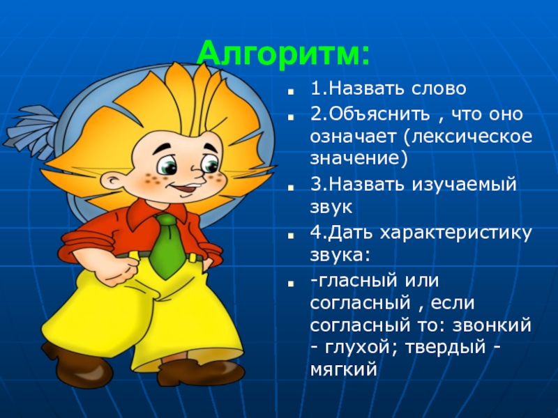 Алгоритм:1.Назвать слово2.Объяснить , что оно означает (лексическое значение)3.Назвать изучаемый звук4.Дать характеристику звука:-гласный или согласный , если согласный