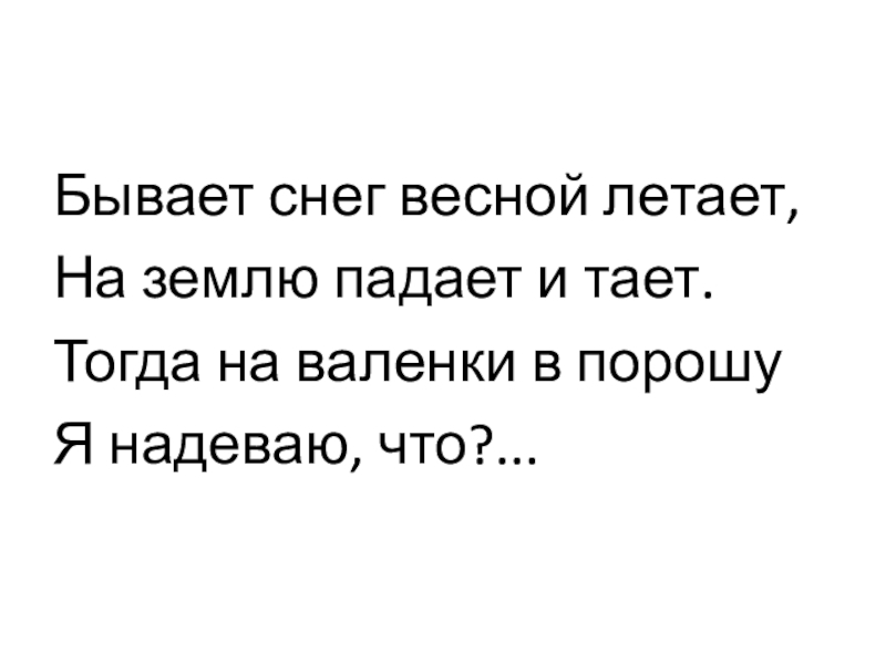 Бывает снег весной летает,На землю падает и тает.Тогда на валенки в порошуЯ надеваю, что?...