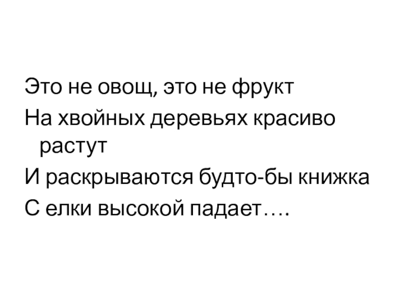 Это не овощ, это не фруктНа хвойных деревьях красиво растутИ раскрываются будто-бы книжкаС елки высокой падает….