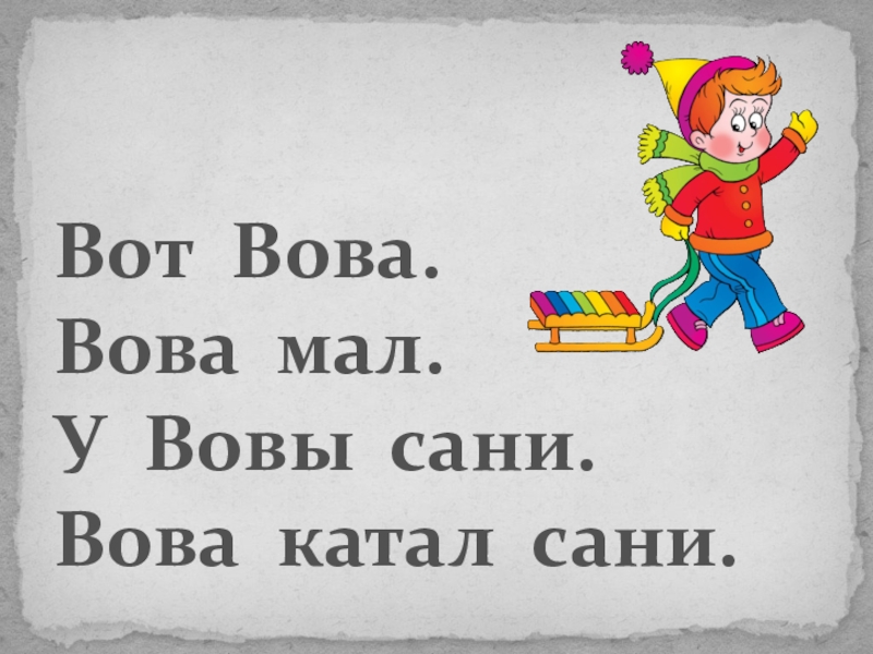 Вот Вова.Вова мал.У Вовы сани.Вова катал сани.