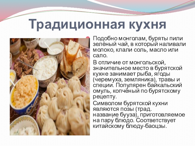 В отличие от монгольской, значительное место в бурятской кухне занимает рыба, ягоды (черемуха, земляника), травы и специи. Популярен байкальский омуль, копчёный по бурятскому рецепту.