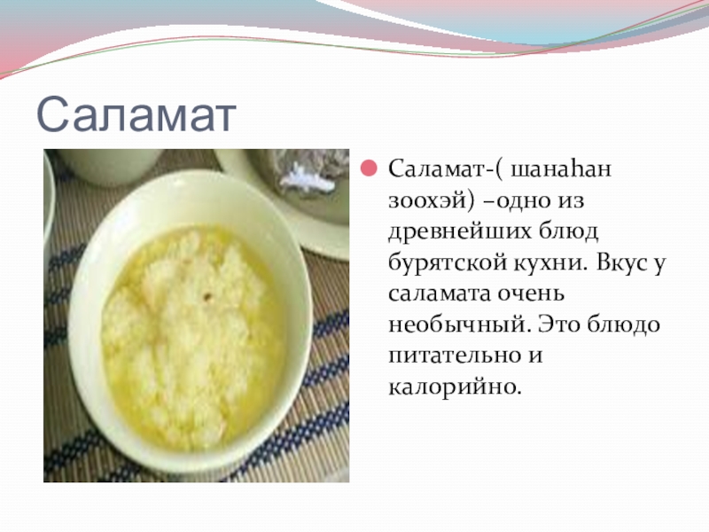 Саламат-( шанаhан зоохэй) –одно из древнейших блюд бурятской кухни. Вкус у