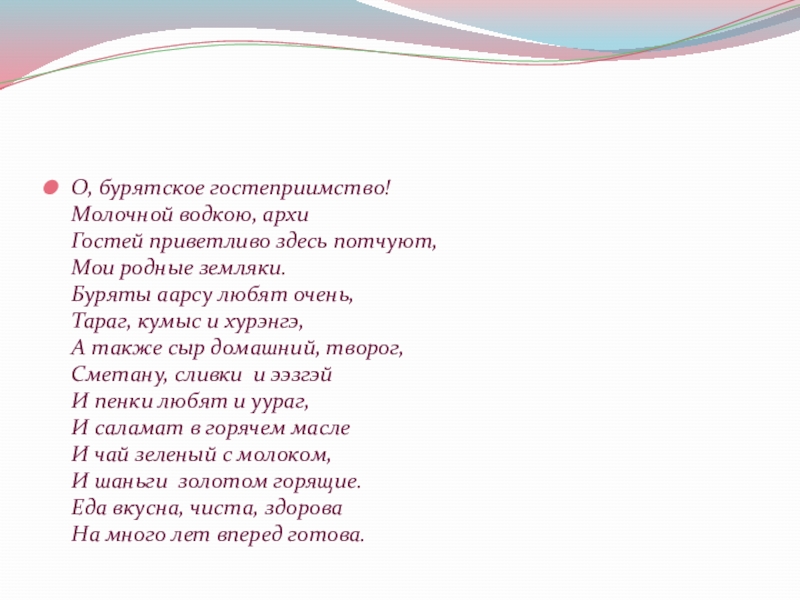 Подобно монголам, буряты пили зелёный чай, в который наливали молоко, клали