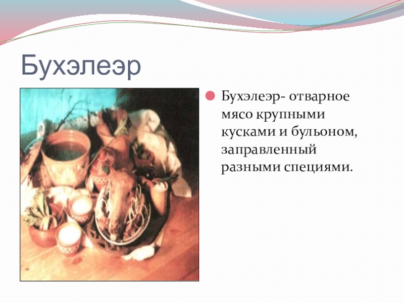 Бухэлеэр- отварное мясо крупными кусками и бульоном, заправленный разными специями.