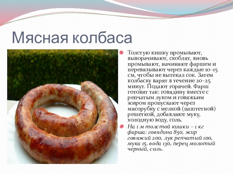 перевязывают через каждые 10–15 см, чтобы не вытекал сок. Затем колбаску варят в течение 20–25 минут. Подают горячей. Фарш готовят так: говядину вместе с репчатым луком и говяжьим жиром пропускают через мясорубку с мелкой (паштетной) решеткой, добавляют муку, холодную воду, соль.
