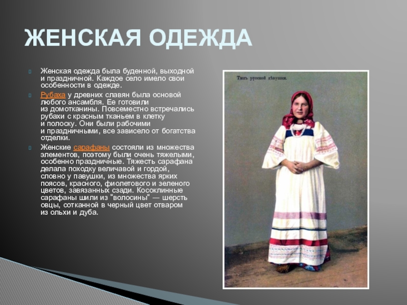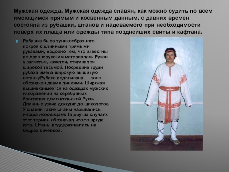 Мужская одежда. Мужская одежда славян, как можно судить по всем имеющимся прямым и косвенным данным, с давних времен состояла из рубашки, штанов и надеваемого при необходимости поверх их плаща или одежды типа позднейших свиты и кафтана.