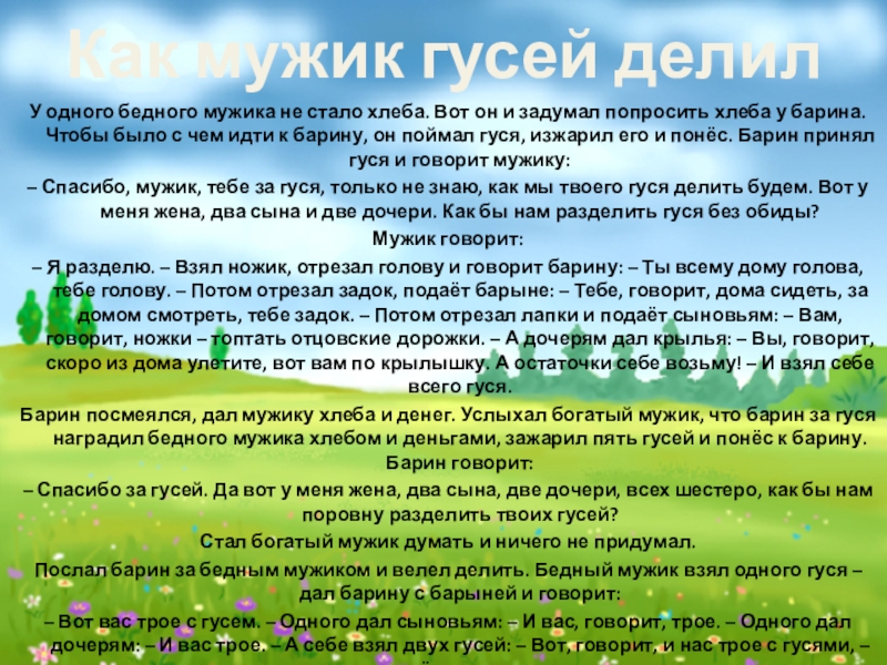 Слайд 5Как мужик гусей делил
