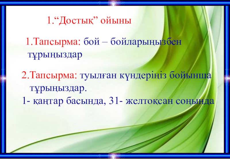 1.“Достық” ойыны1.Тапсырма: бой – бойларыңызбен тұрыңыздар2.Тапсырма: туылған күндеріңіз бойынша тұрыңыздар.1- қаңтар басында, 31- желтоқсан соңында