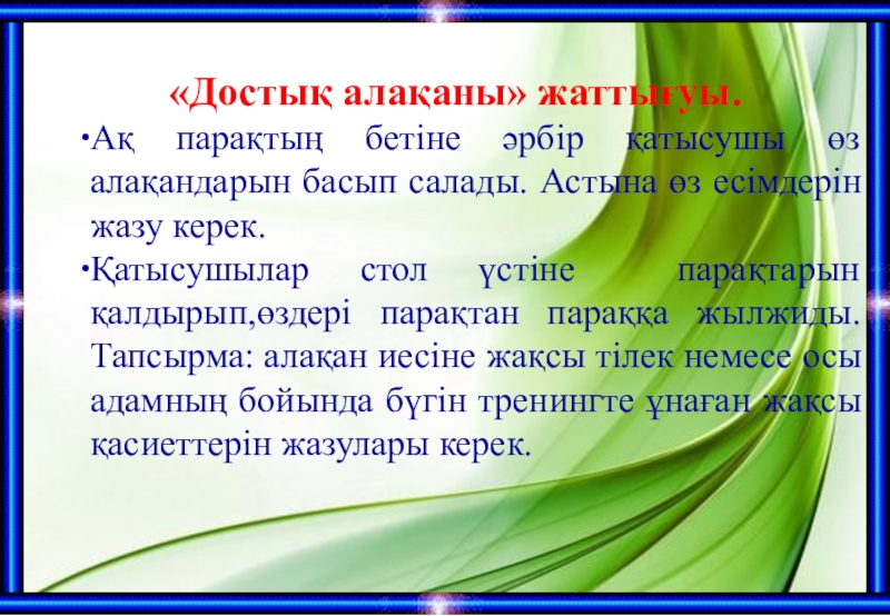 «Достық алақаны» жаттығуы. Ақ парақтың бетіне әрбір қатысушы өз алақандарын басып салады. Астына өз есімдерін жазу керек.