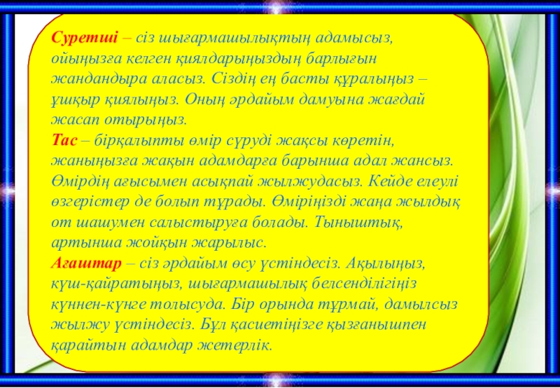 Суретші – сіз шығармашылықтың адамысыз, ойыңызға келген қиялдарыңыздың барлығын жандандыра аласыз. Сіздің ең басты құралыңыз – ұшқыр қиялыңыз.