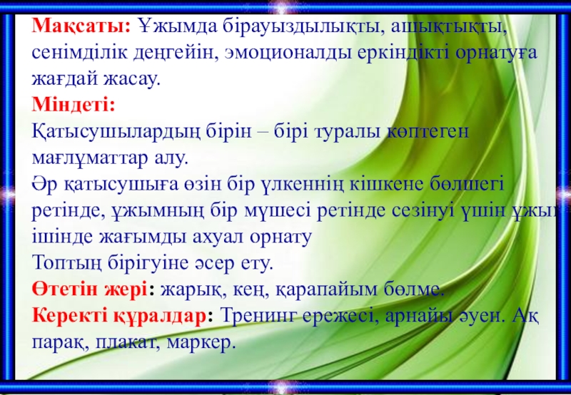Слайд 2Мақсаты: Ұжымда бірауыздылықты, ашықтықты, сенімділік деңгейін, эмоционалды еркіндікті орнатуға жағдай жасау.
