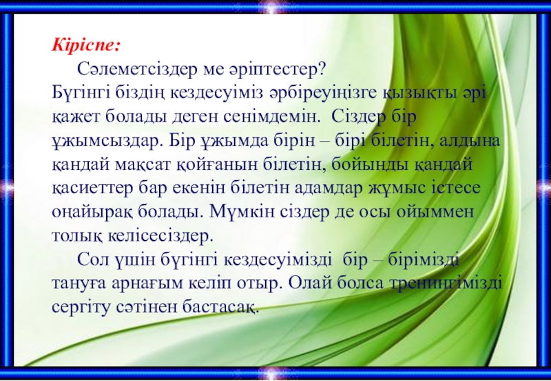 Кіріспе:	Сәлеметсіздер ме әріптестер?Бүгінгі біздің кездесуіміз әрбіреуіңізге қызықты әрі қажет болады деген сенімдемін. Сіздер бір ұжымсыздар. Бір ұжымда