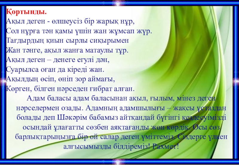 Қортынды.Ақыл деген - өлшеусіз бір жарық нұр,Сол нұрға тән қамы үшін жан жұмсап жүр.Тағдырдың қиын сырлы сиқырыменЖан