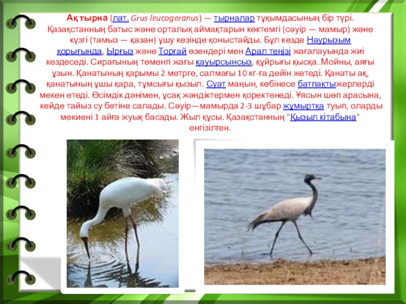 Слайд 25Ақ тырна (лат. Grus leucogeranus) — тырналар тұқымдасының бір түрі. Қазақстанның батыс және орталық аймақтарын