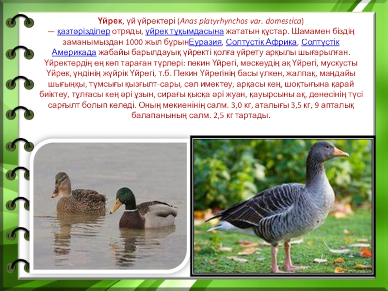 Слайд 20Үйрек, үй үйректері (Anas platyrhynchos var. domestіca) — қазтәрізділер отряды, үйрек тұқымдасына жататын құстар. Шамамен