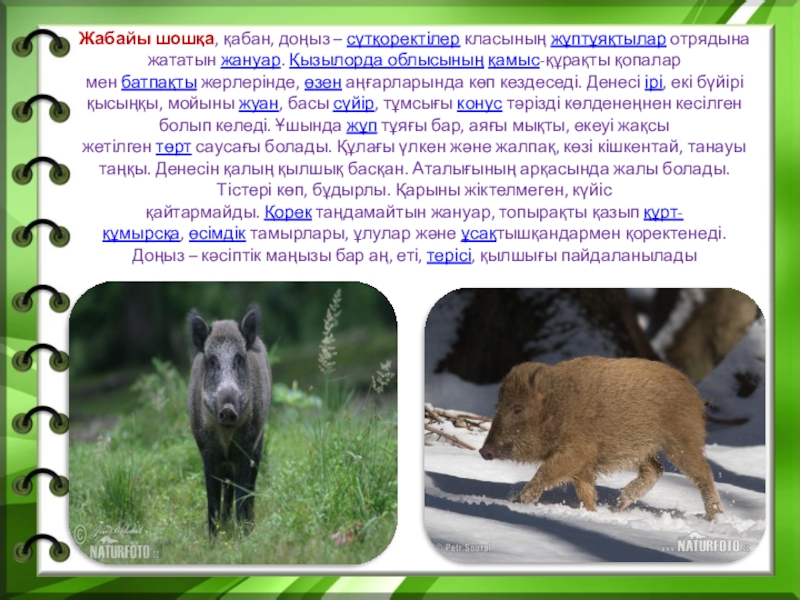 Слайд 7Жабайы шошқа, қабан, доңыз – сүтқоректілер класының жұптұяқтылар отрядына жататын жануар. Қызылорда облысының қамыс-құрақты қопалар мен батпақты жерлерінде, өзен аңғарларында көп кездеседі.