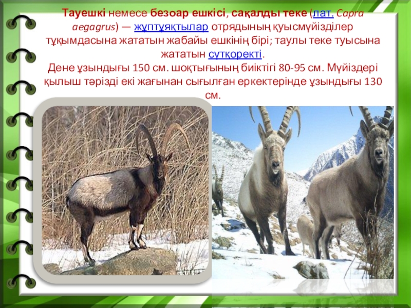 Слайд 16Тауешкі немесе безоар ешкісі, сақалды теке (лат. Capra aegagrus) — жұптұяқтылар отрядының қуысмүйізділер тұқымдасына жататын жабайы ешкінің бірі;