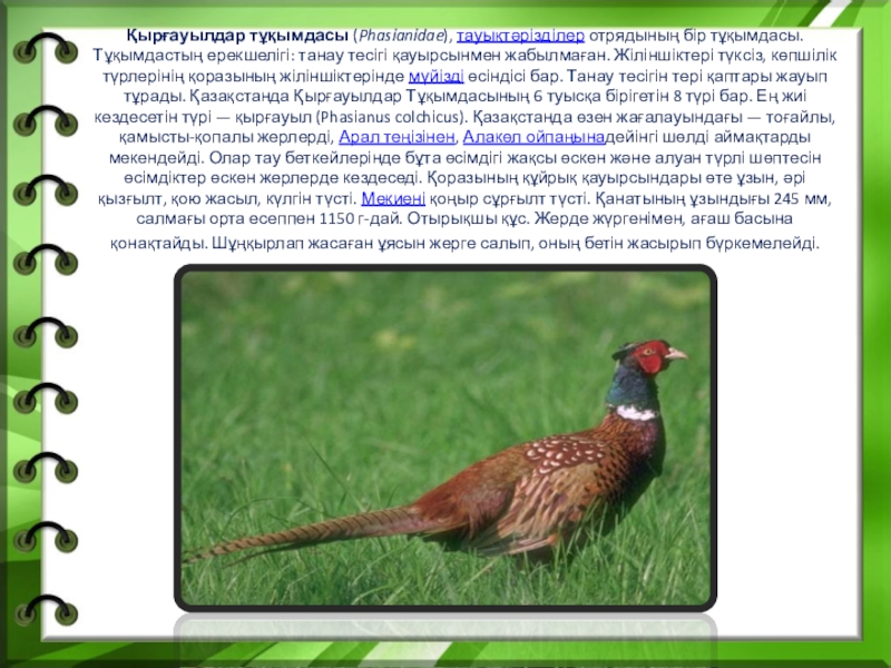 Слайд 22Қырғауылдар тұқымдасы (Phasіanіdae), тауықтәрізділер отрядының бір тұқымдасы. Тұқымдастың ерекшелігі: танау тесігі қауырсынмен жабылмаған. Жіліншіктері