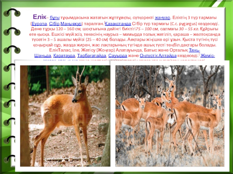Слайд 5Елік– бұғы тұқымдасына жататын жұптұяқты, сүтқоректі жануар. Еліктің 3 түр тармағы (Еуропа, Сібір,Маньчжур) таралған.[Қазақстанда Сібір түр