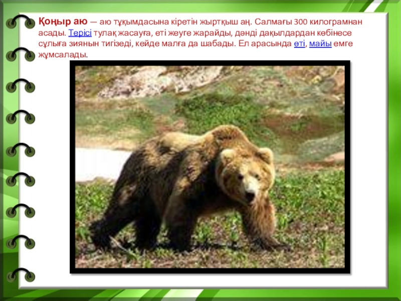 Слайд 13Қоңыр аю — аю тұқымдасына кіретін жыртқыш аң. Салмағы 300 килограмнан асады. Терісі тулақ