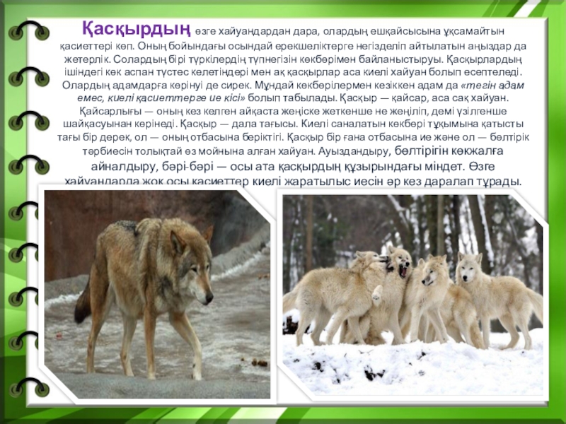 Слайд 6Қасқырдың өзге хайуандардан дара, олардың ешқайсысына ұқсамайтын қасиеттері көп. Оның бойындағы