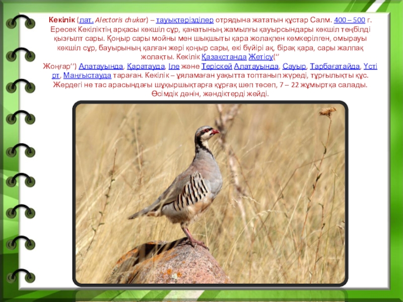 Слайд 23Кекілік (лат. Alectoris chukar) – тауықтәрізділер отрядына жататын құстар Салм. 400 – 500 г. Ересек Кекіліктің арқасы