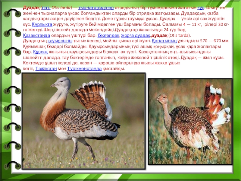 Слайд 19Дуадақ (лат. Otis tarda) — тырнатәрізділер отрядының бір тұқымдасына жататын құс. Шығу тегі жөнінен тырналарға ұқсас