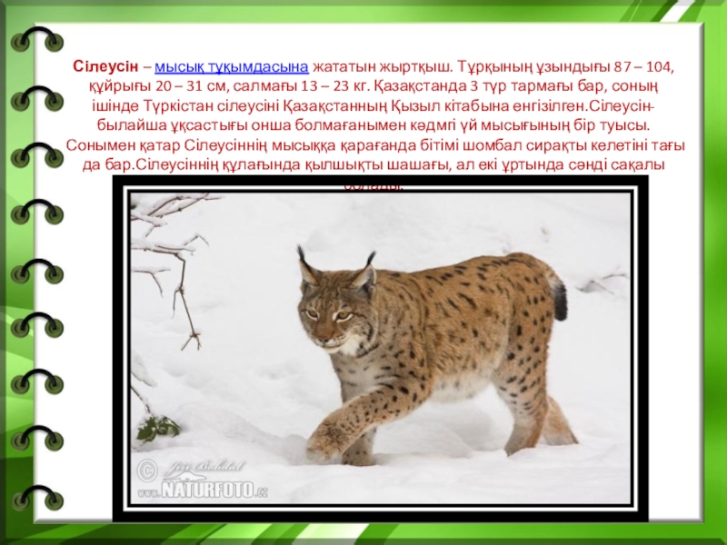Слайд 10Сілеусін – мысық тұқымдасына жататын жыртқыш. Тұрқының ұзындығы 87 – 104, құйрығы 20 –