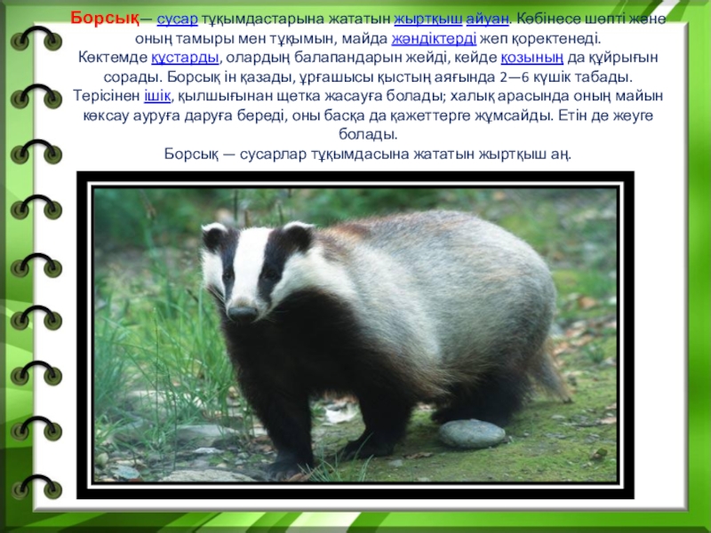 Слайд 9Борсық— сусар тұқымдастарына жататын жыртқыш айуан. Көбінесе шөпті және оның тамыры мен тұқымын, майда жәндіктерді жеп қоректенеді.