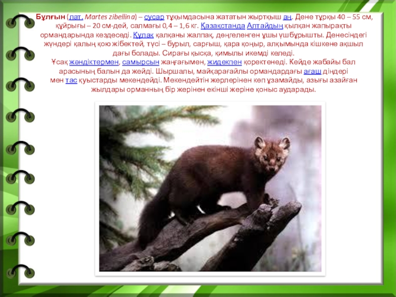 Слайд 18Бұлғын (лат. Martes zibellina) – сусар тұқымдасына жататын жыртқыш аң. Дене тұрқы 40 – 55 см,