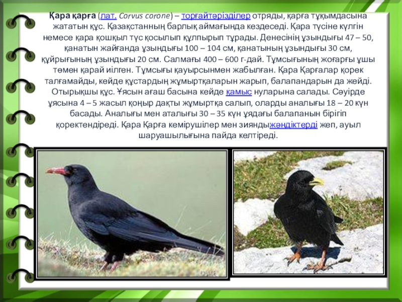 Слайд 29Қара қарға (лат. Corvus corone) – торғайтәрізділер отряды, қарға тұқымдасына жататын құс. Қазақстанның барлық аймағында
