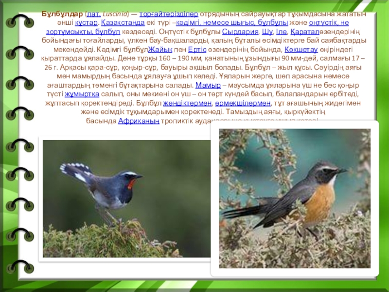 Слайд 27Бұлбұлдар (лат. Luscinia) — торғайтәрізділер отрядының сайрауықтар тұқымдасына жататын әнші құстар. Қазақстанда екі түрі –кәдімгі, немесе шығыс, бұлбұлы және оңтүстік,