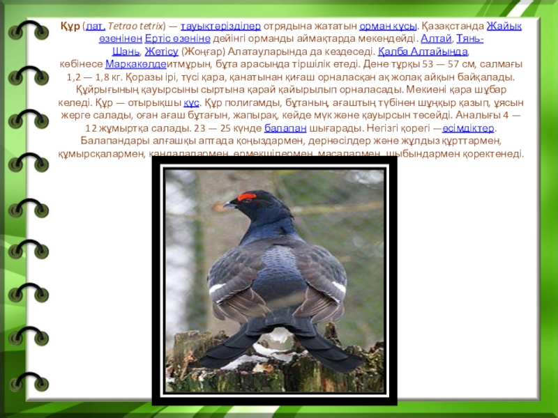 Слайд 26Құр (лат. Tetrao tetrix) — тауықтәрізділер отрядына жататын орман құсы. Қазақстанда Жайық өзенінен Ертіс өзеніне дейінгі орманды аймақтарда мекендейді. Алтай, Тянь-Шань, Жетісу (Жоңғар)