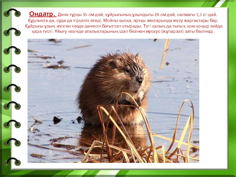 Слайд 11Ондатр. Дене тұрқы 35 см-дей, құйрығының ұзындығы 28 см-дей, салмағы 1,5