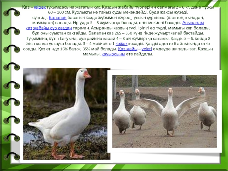 Слайд 21Қаз – үйрек тұқымдасына жататын құс. Қаздың жабайы түрлерінің салмағы 2 – 6 кг,
