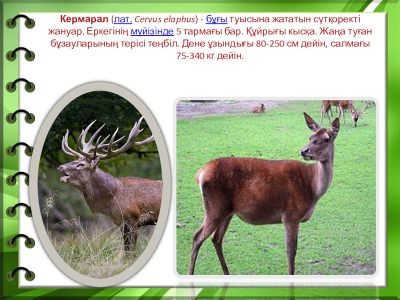Слайд 17Кермарал (лат. Cervus elaphus) - бұғы туысына жататын сүтқоректі жануар. Еркегінің мүйізінде 5 тармағы бар. Құйрығы кысқа.
