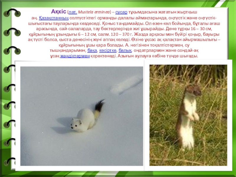 Слайд 14Ақкіс (лат. Mustela erminea) – сусар тұқымдасына жататын жыртқыш аң. Қазақстанның солтүстіктегі орманды-далалы аймақтарында, оңтүстік және оңтүстік-шығыстағы