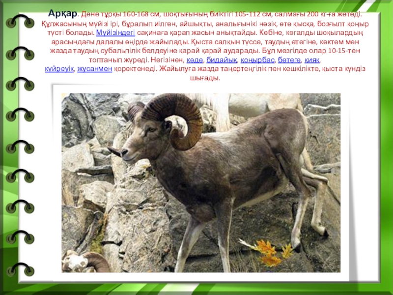 Слайд 15Арқар. Дене тұрқы 160-168 см, шоқтығының биіктігі 105-112 см, салмағы 200