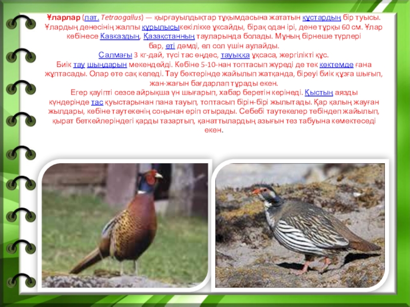 Слайд 28Ұларлар (лат. Tetraogallus) — қырғауылдықтар тұқымдасына жататын құстардың бір туысы. Ұлардың денесінің жалпы құрылысыкекілікке ұксайды, бірақ
