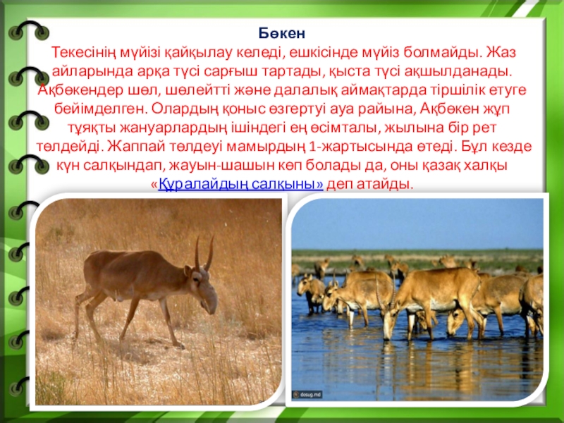 түсі сарғыш тартады, қыста түсі ақшылданады. Ақбөкендер шөл, шөлейтті және далалық аймақтарда тіршілік етуге бейімделген. Олардың қоныс өзгертуі ауа райына, Ақбөкен жұп тұяқты жануарлардың ішіндегі ең өсімталы, жылына бір рет төлдейді. Жаппай төлдеуі мамырдың 1-жартысында өтеді. Бұл кезде күн салқындап, жауын-шашын көп болады да, оны қазақ халқы