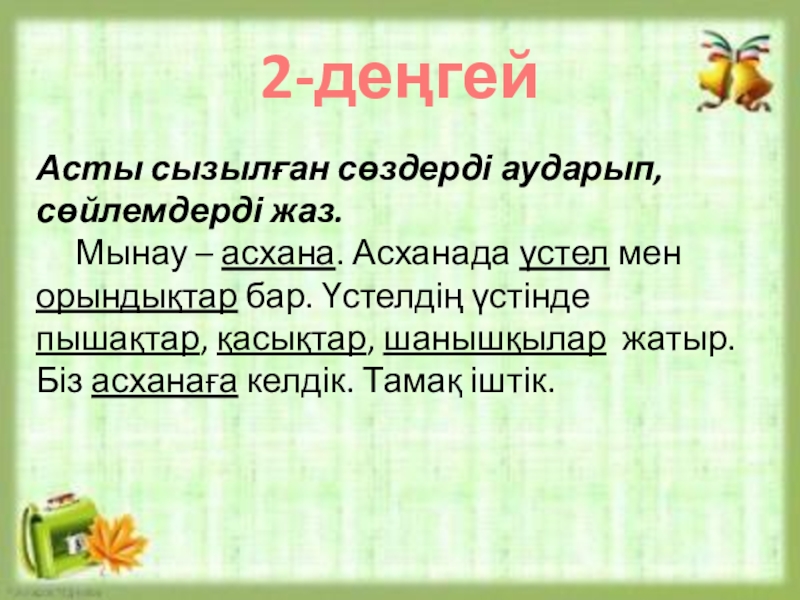 2-деңгейАсты сызылған сөздерді аударып, сөйлемдерді жаз.	Мынау – асхана. Асханада үстел мен орындықтар бар. Үстелдің үстінде пышақтар, қасықтар,