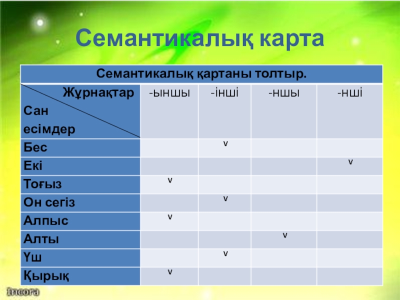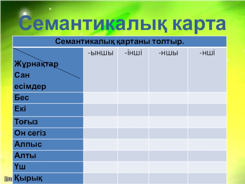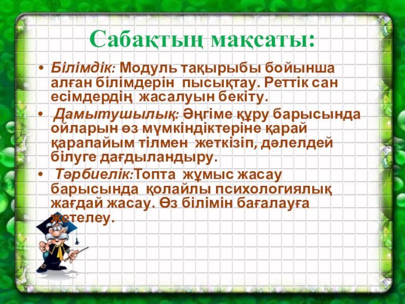 Сабақтың мақсаты:Білімдік: Модуль тақырыбы бойынша алған білімдерін пысықтау. Реттік сан есімдердің жасалуын бекіту. Дамытушылық: Әңгіме құру барысында