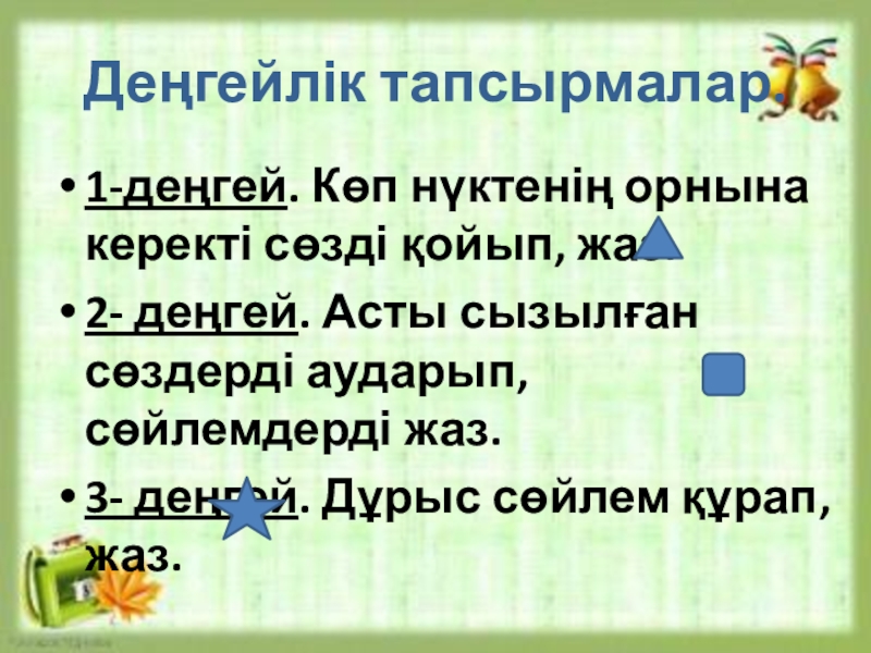 Деңгейлік тапсырмалар.1-деңгей. Көп нүктенің орнына керекті сөзді қойып, жаз.2- деңгей. Асты сызылған сөздерді аударып, сөйлемдерді жаз.3- деңгей.