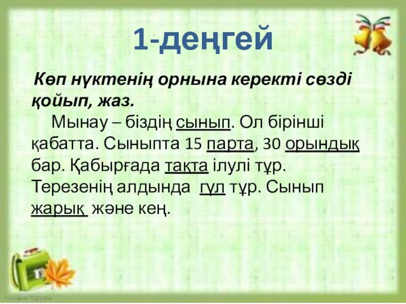 1-деңгей Көп нүктенің орнына керекті сөзді қойып, жаз. 	Мынау – біздің сынып. Ол бірінші қабатта. Сыныпта 15 парта,