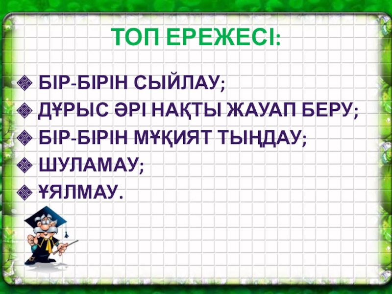 ТОП ЕРЕЖЕСІ:Бір-бірін сыйлау;Дұрыс әрі нақты жауап беру;Бір-бірін мұқият тыңдау;Шуламау;Ұялмау.