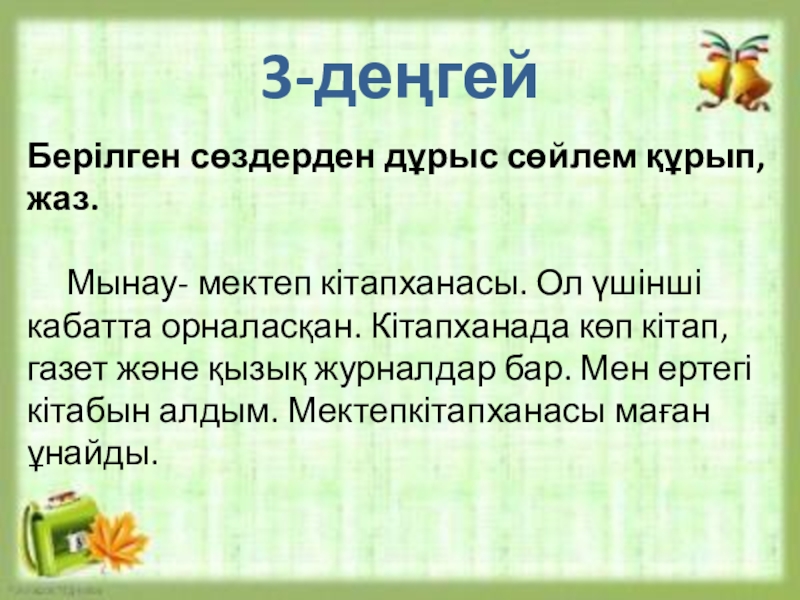 3-деңгейБерілген сөздерден дұрыс сөйлем құрып, жаз.		Мынау- мектеп кітапханасы. Ол үшінші кабатта орналасқан. Кітапханада көп кітап,газет және қызық