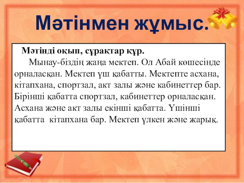 Мәтінмен жұмыс.   Мәтінді оқып, сұрақтар құр. Мынау-біздің жаңа мектеп. Ол Абай көшесінде орналасқан. Мектеп