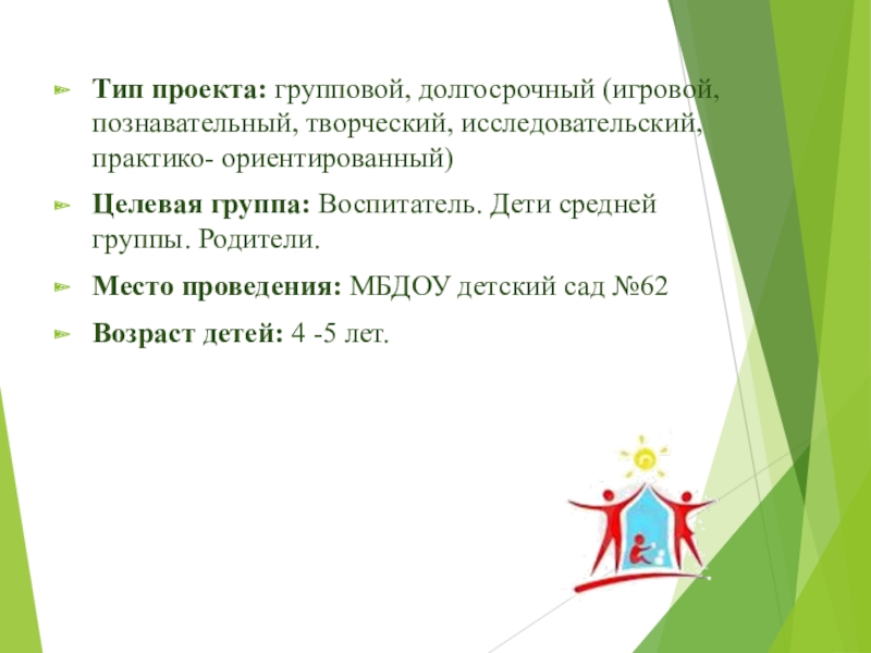 Слайд 3Тип проекта: групповой, долгосрочный (игровой, познавательный, творческий, исследовательский, практико- ориентированный)